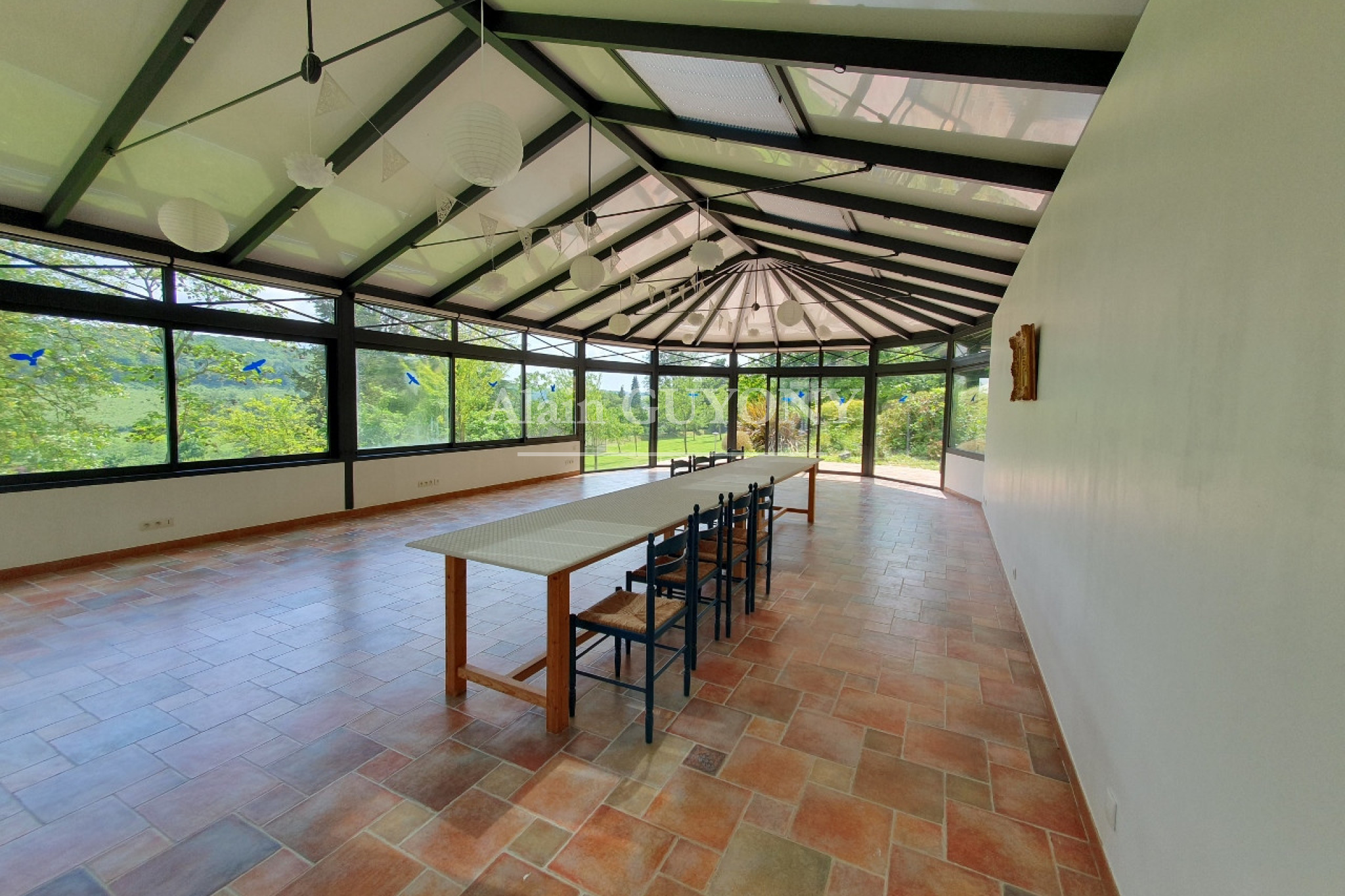 Au rez-de-chaussée : entrée avec vestiaire et wc, cuisine aménagée et équipée, arrière-cuisine avec buanderie, salon avec cheminée, salle à manger également dotée d'une cheminée, chambre avec salle d'eau privative et wc. Préau attenant ouvrant sur une vaste véranda d'environ 74 m².