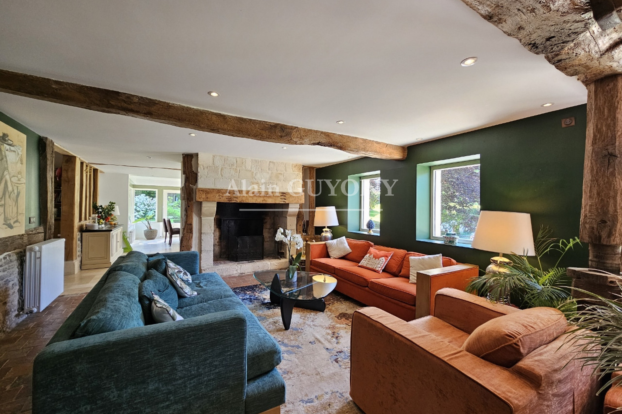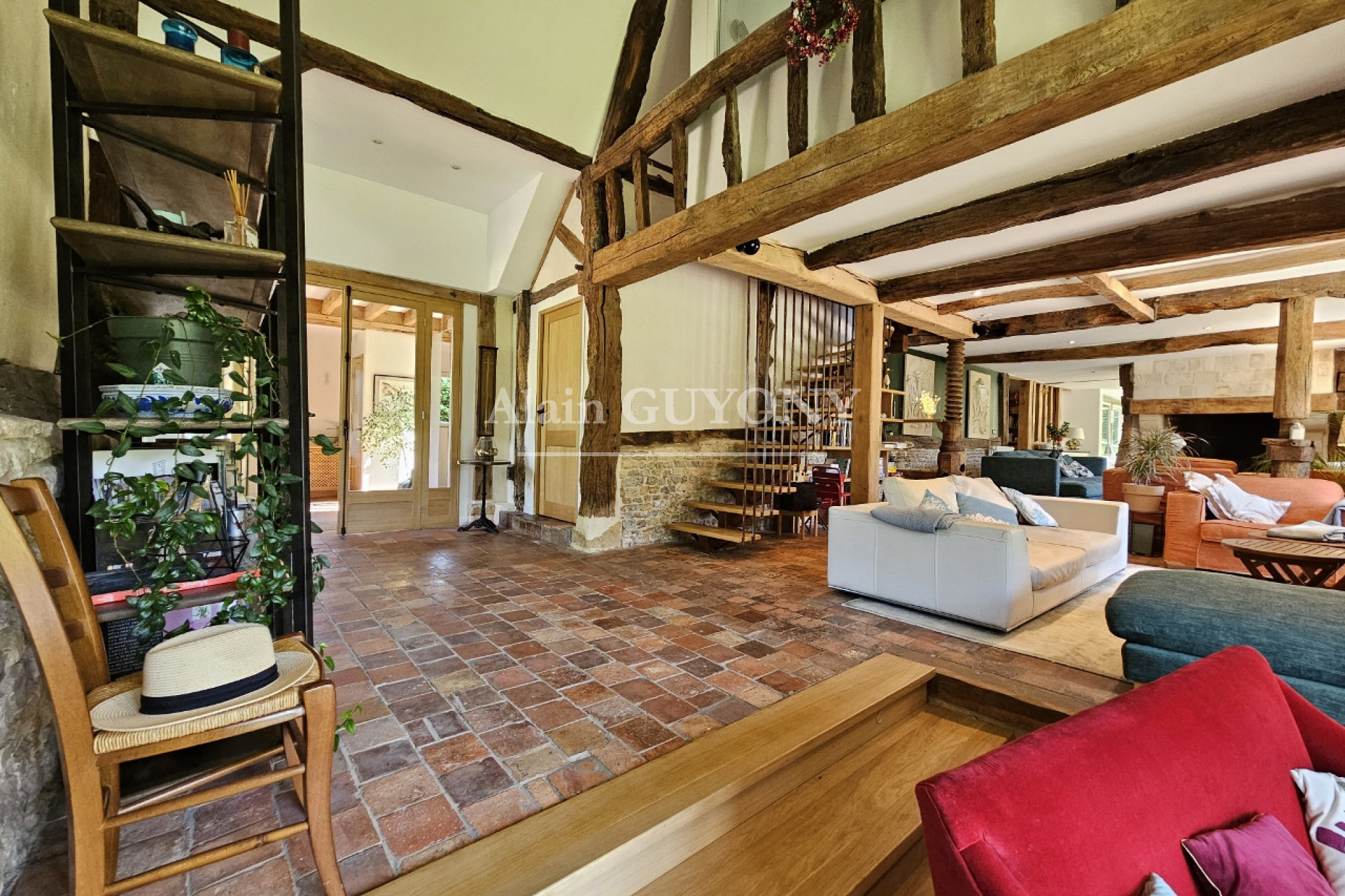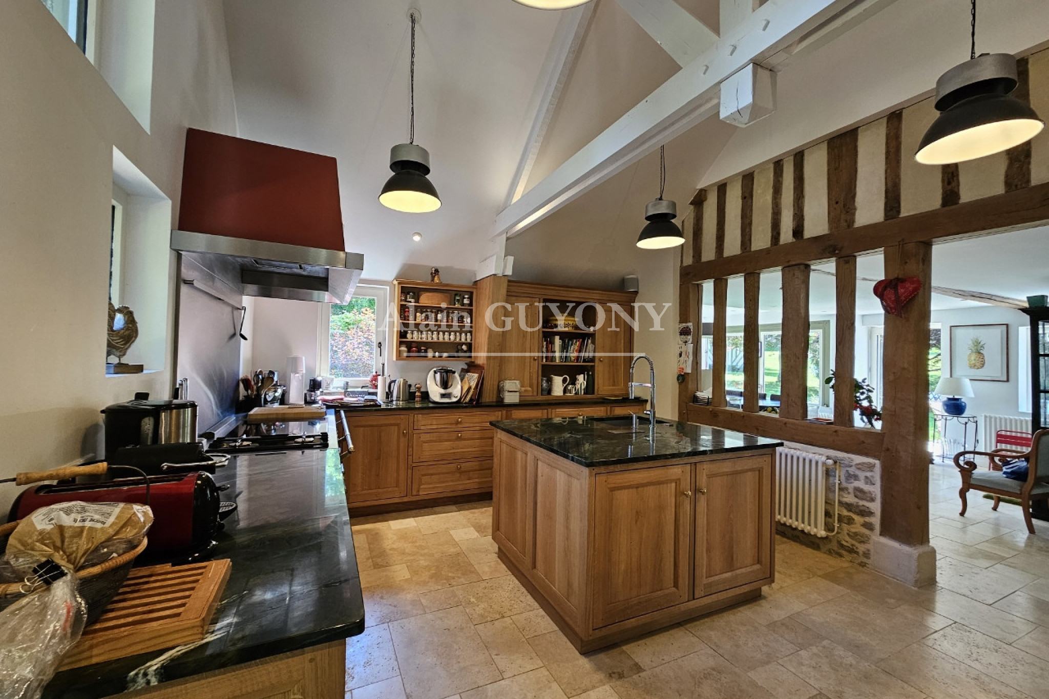 La maison principale, construite en colombages et pierres, offre au rez-de-chaussée : une entrée avec vestiaire, un wc, un bureau, un petit salon avec salle d'eau et chambre en mezzanine, un spacieux salon avec cheminée, une cuisine aménagée & équipée autour d’un îlot central avec piano Lacanche, une salle à manger conviviale, une buanderie, une réserve et une chaufferie. A l'étage, une chambre avec salle d'eau et wc, une autre chambre avec cheminée, salle d'eau et wc.