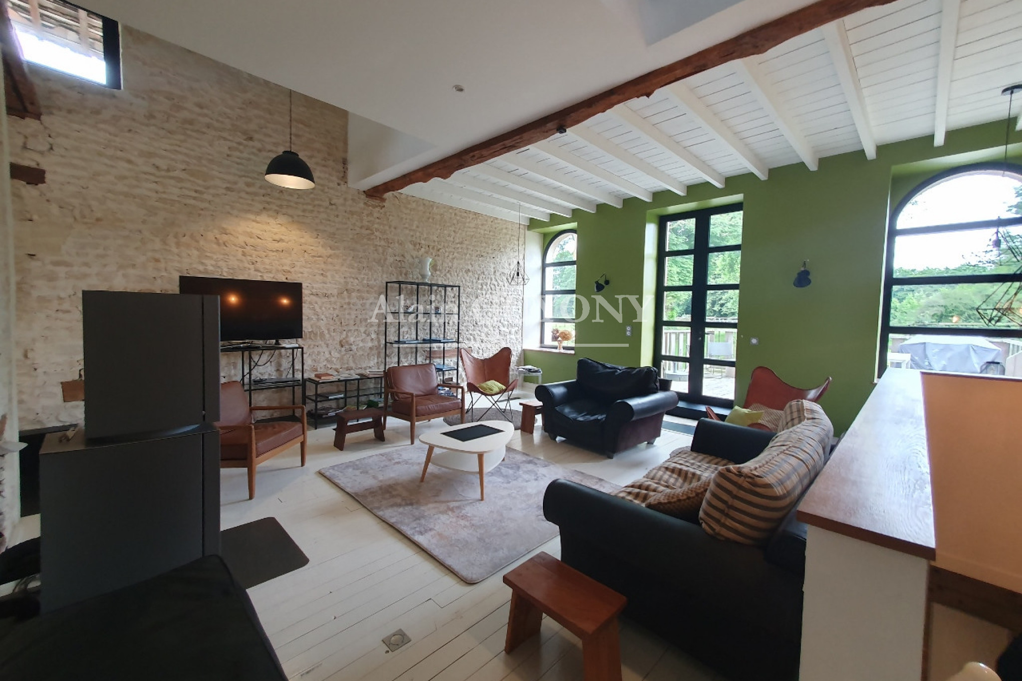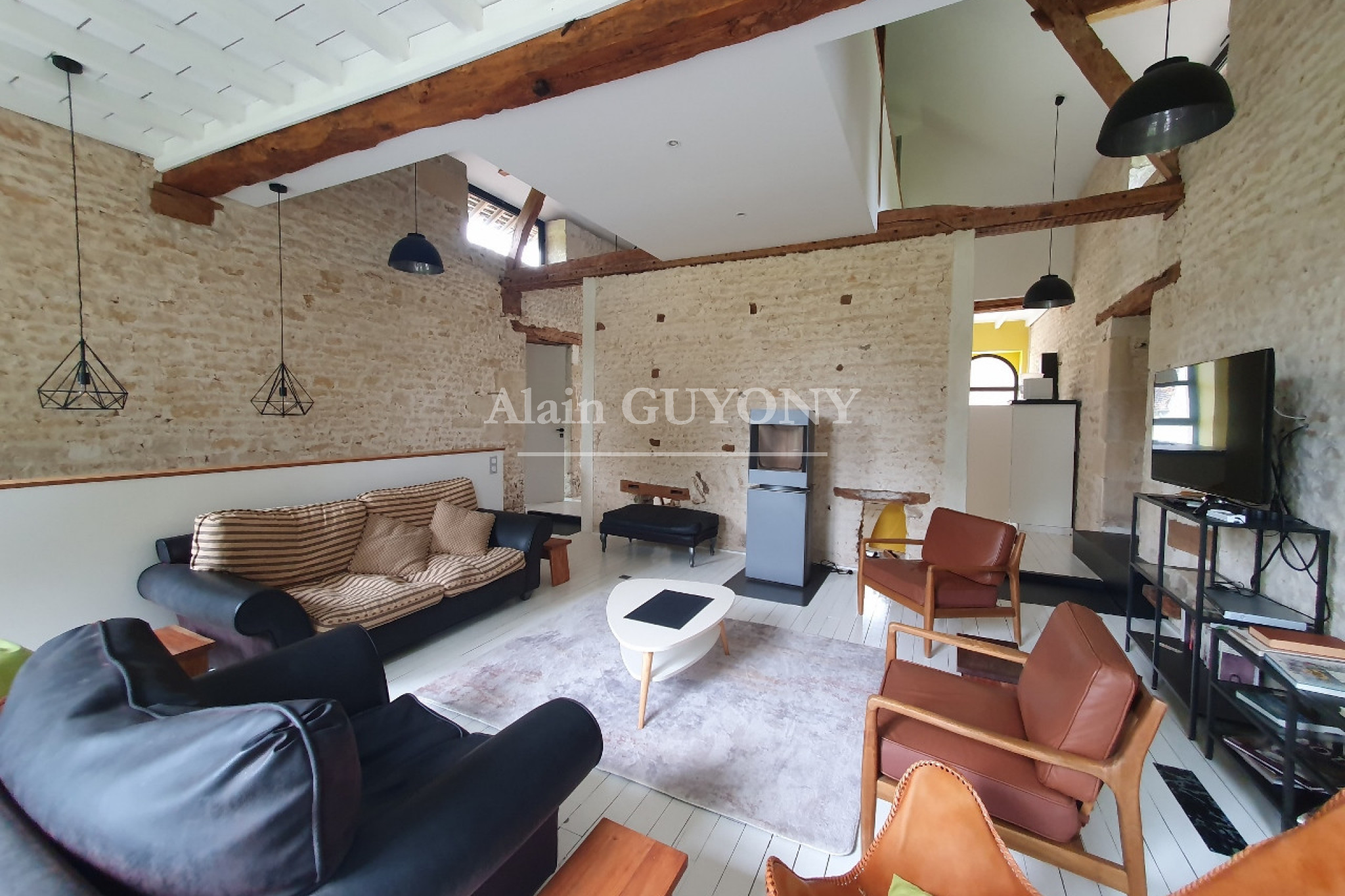 Ancienne graineterie rénovée - env. 77 m², parfaite pour une maison d’amis ou gîte : RDC : entrée, cuisine aménagée, salle à manger, double salon, chambre, salle d’eau, cellier et wc. Étage : chambre palière avec mezzanine.